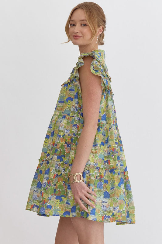 Green and Blue Pops Ruffle Sleeve Dress